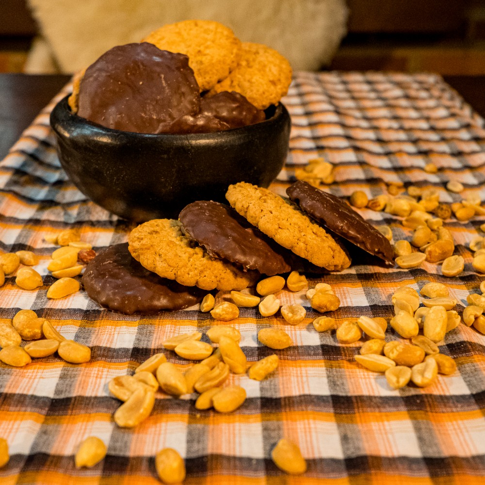 Biscoito de Amendoim com Cobertura de Chocolate Preto delicioso biscoito artesanal feito com amendoim natural e finalizado com uma camada de chocolate preto.