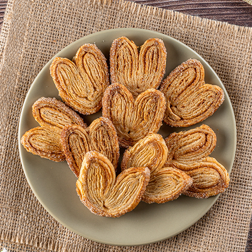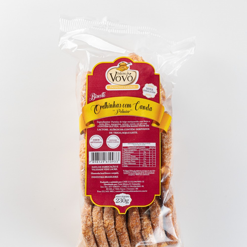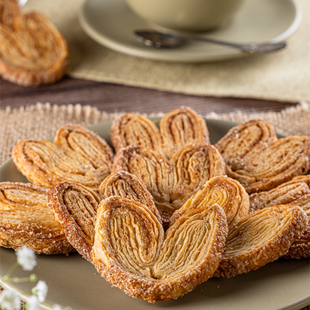 Biscoito Orelhinha com Canela (Palmier)Delicado e crocante, esse biscoito em formato de orelhinha é feito com massa folhada dourada e polvilhado com açúcar e canela. Leve, doce na medida certa e com aquele toque especial de canela que faz toda a diferença.