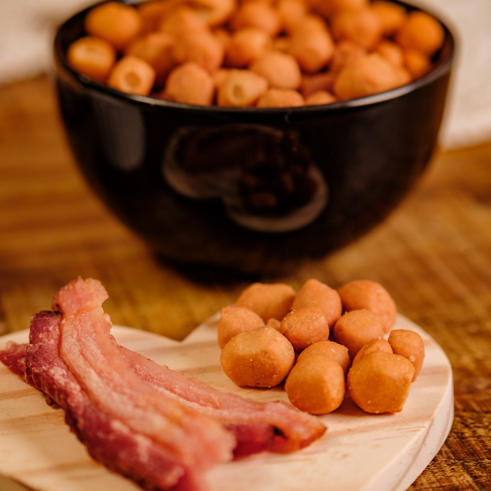 rocante por fora e recheada com pedaços de bacon saborosos, essa bolinha é a combinação perfeita de maciez e sabor intenso.
